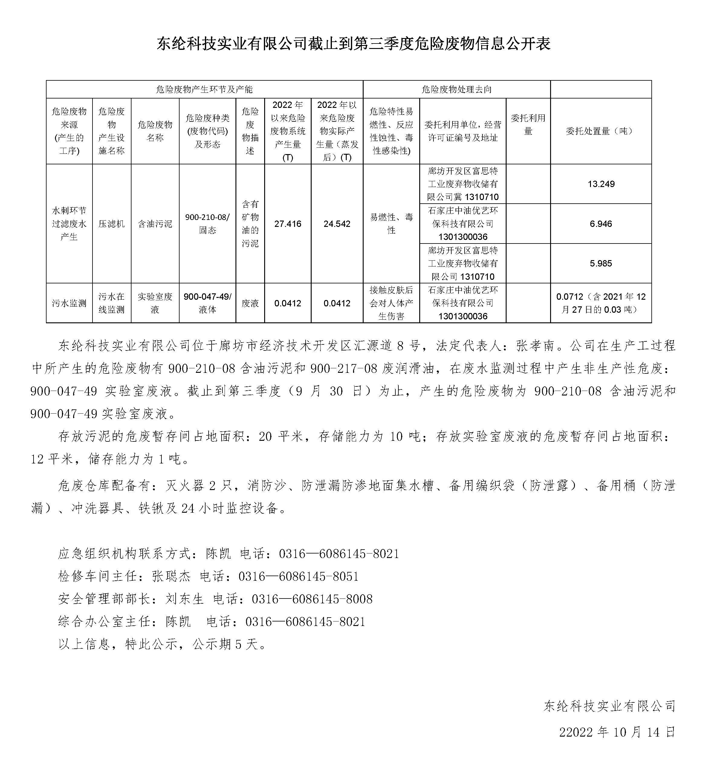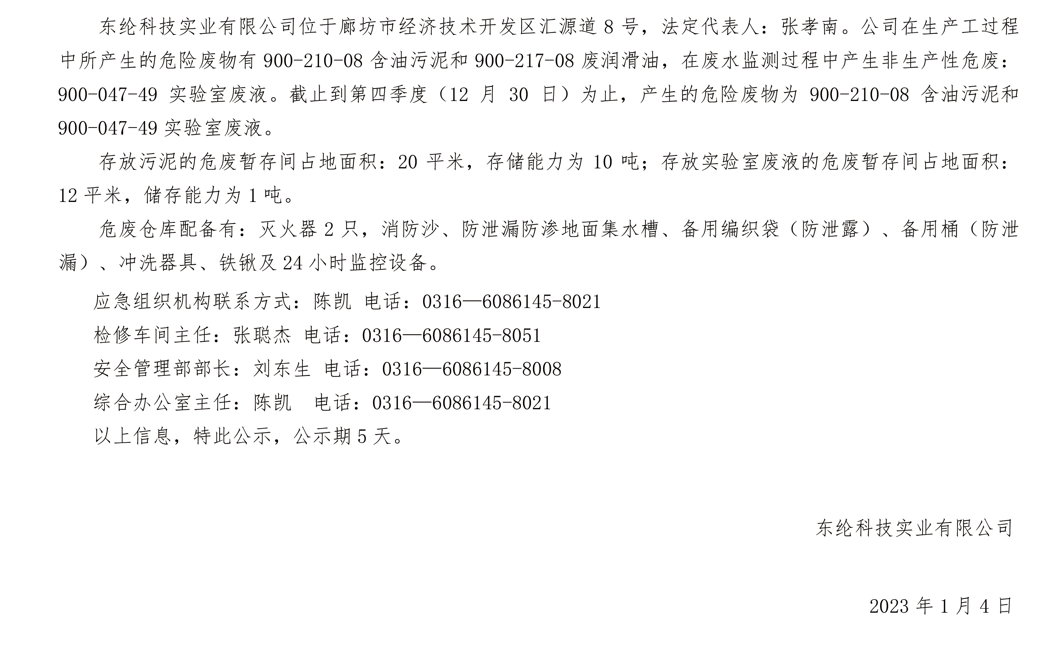 東綸科技實業(yè)有限公司位于廊坊市經(jīng)濟技術(shù)開發(fā)區(qū)匯源道8號,法定代表人:張孝南。公司在生產(chǎn)工過程中所產(chǎn)生的危險廢物有900-210-08含油污泥和900-217-08廢潤滑油,在廢水監(jiān)測過程中產(chǎn)生非生產(chǎn)性危廢:900-047-4