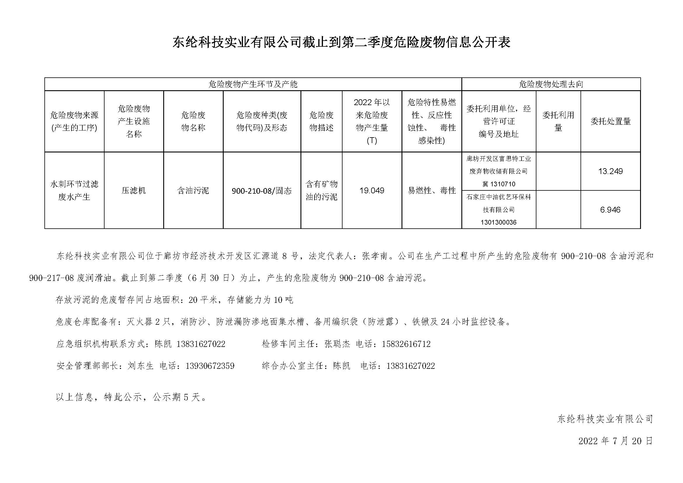 東綸科技實(shí)業(yè)有限公司位于廊坊市經(jīng)濟(jì)技術(shù)開(kāi)發(fā)區(qū)匯源道8號(hào),法定代表人:張孝南。公司在生產(chǎn)工過(guò)程中所產(chǎn)生的危險(xiǎn)廢物有900-210-08含油污泥和900-217-08廢潤(rùn)滑油。截止到第二季度(6月30日)為止,產(chǎn)生的危險(xiǎn)廢物為90