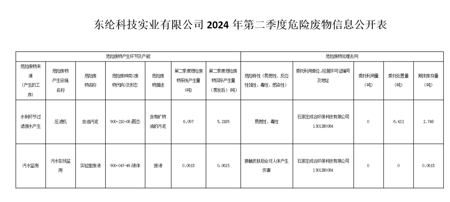 東綸科技實業(yè)有限公司2024年第二季度危險廢物信息公開表 &nbsp; 危險廢物產(chǎn)生環(huán)節(jié)及產(chǎn)能 危險廢物處理去向 危險廢物來源 (產(chǎn)生的工