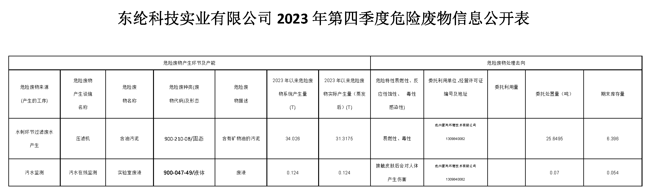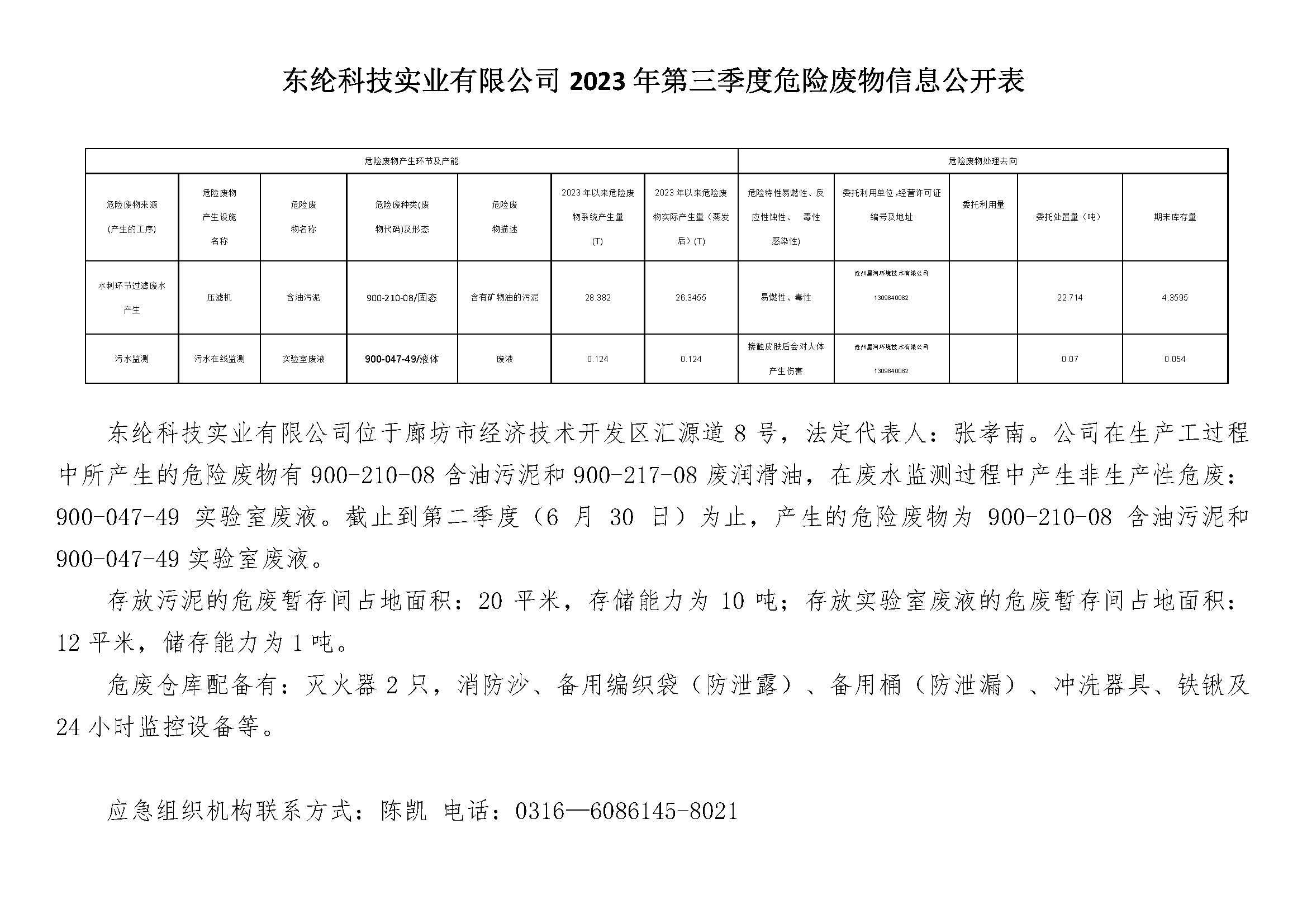 東綸科技實業有限公司位于廊坊市經濟技術開發區匯源道8號,法定代表人:張孝南。公司在生產工過程中所產生的危險廢物有900-210-08含油污泥和900-217-08廢潤滑油,在廢水監測過程中產生非生產性危